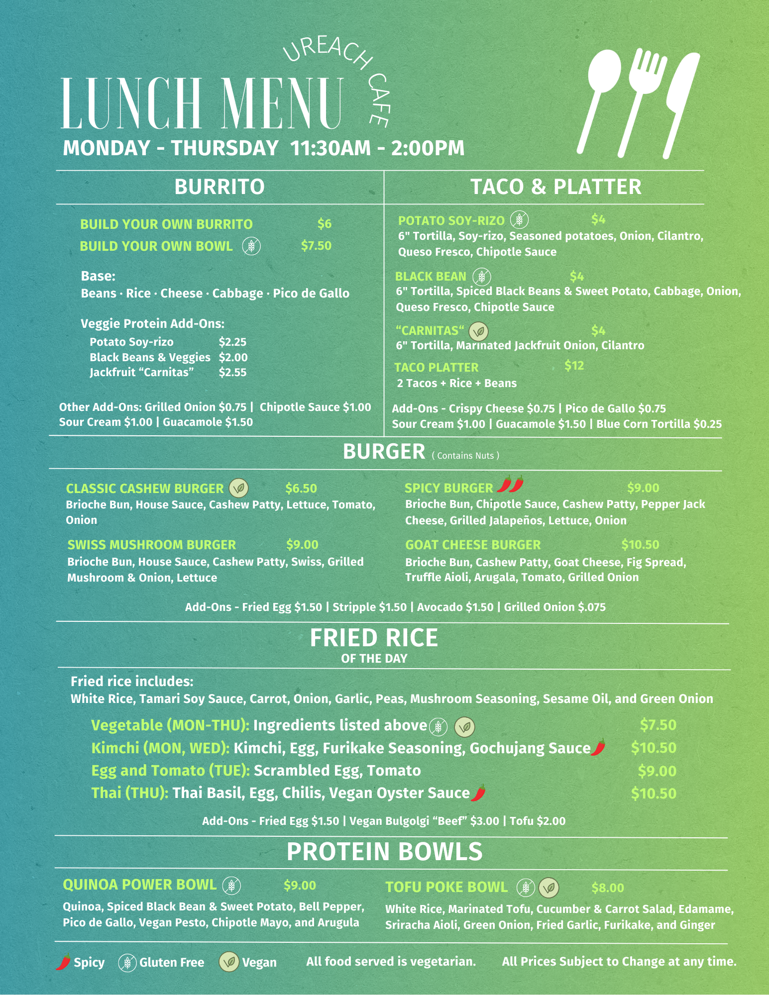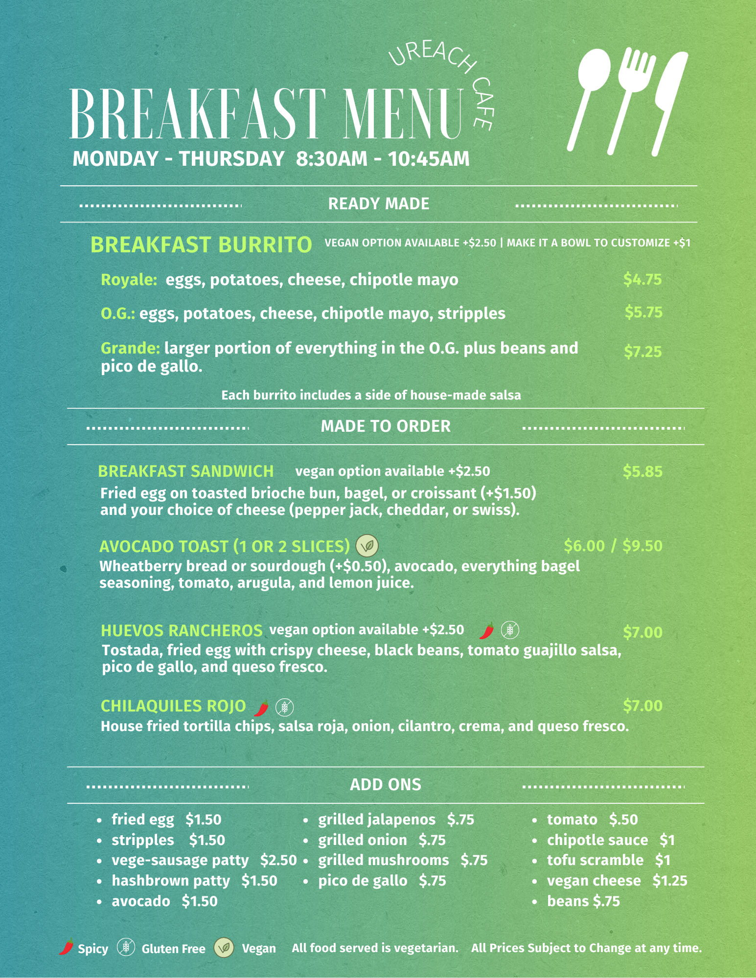If you would like to request catering service form the Café click the button below to fill out the online application. For any request of 75 or more, we require a minimum of 2 weeks notice. We don’t take orders for Saturday or Sunday.
