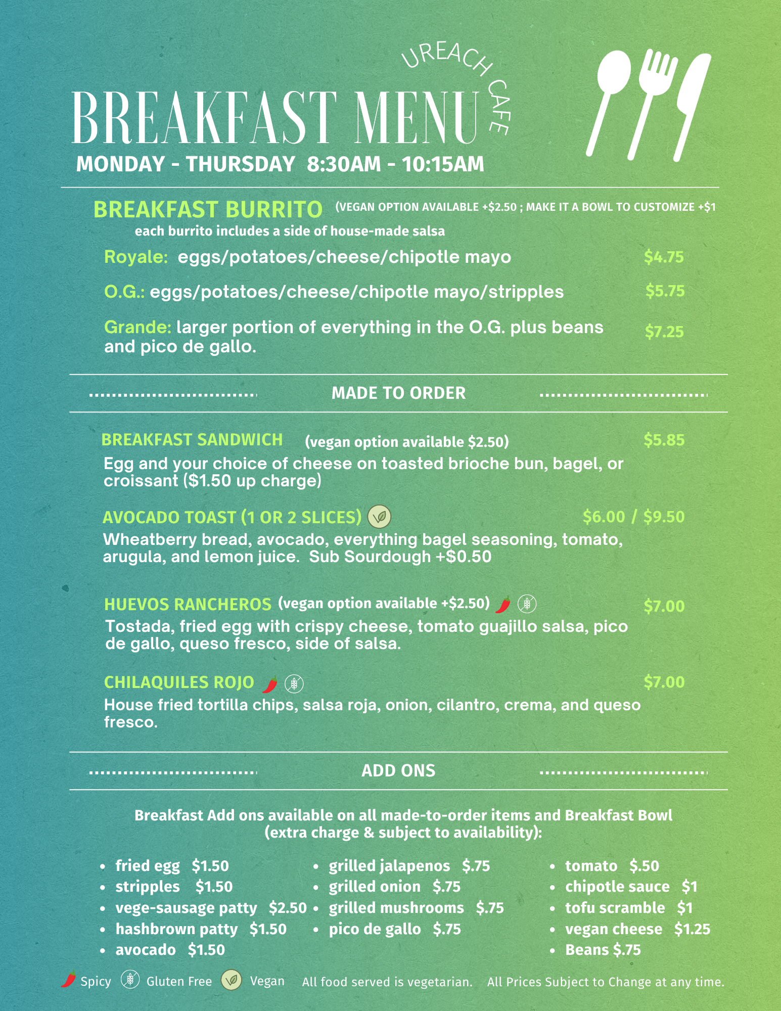 If you would like to request catering service form the Café click the button below to fill out the online application. For any request of 75 or more, we require a minimum of 2 weeks notice. We don’t take orders for Saturday or Sunday.
